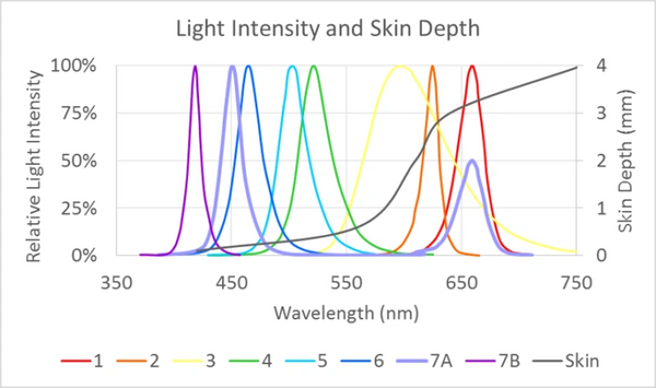 The sixth chakra is activated with a light blue color at 465nm wavelength. This wavelength also penetrates less than 0.5mm into the last layer of skin, increasing blood flow to the third eye.