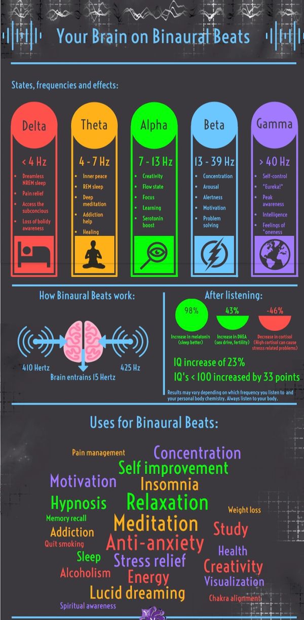 Research has proven that introducing a binaural beat will cause the brain to begin resonating in tune with that beat. By creating a binaural beat at 10 Hz — an alpha frequency — you can trigger your brain to resonate at that same 10 Hz frequency, automatically inducing brain activity in the Alpha range. This same technique can be used to quickly and easily guide your mind into any state.